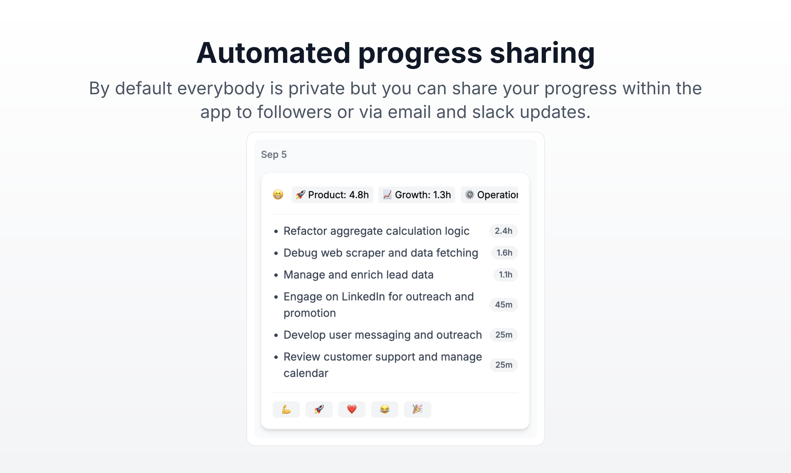 DoneThat automatically keeps track of your work and helps you set realistic goals. It has many built-in privacy safeguards, an optional social feed, and a team plan. It takes 2min to set up and is fully automated after that. No more manual tracking!