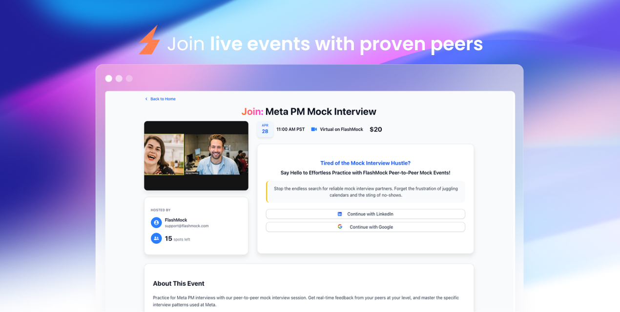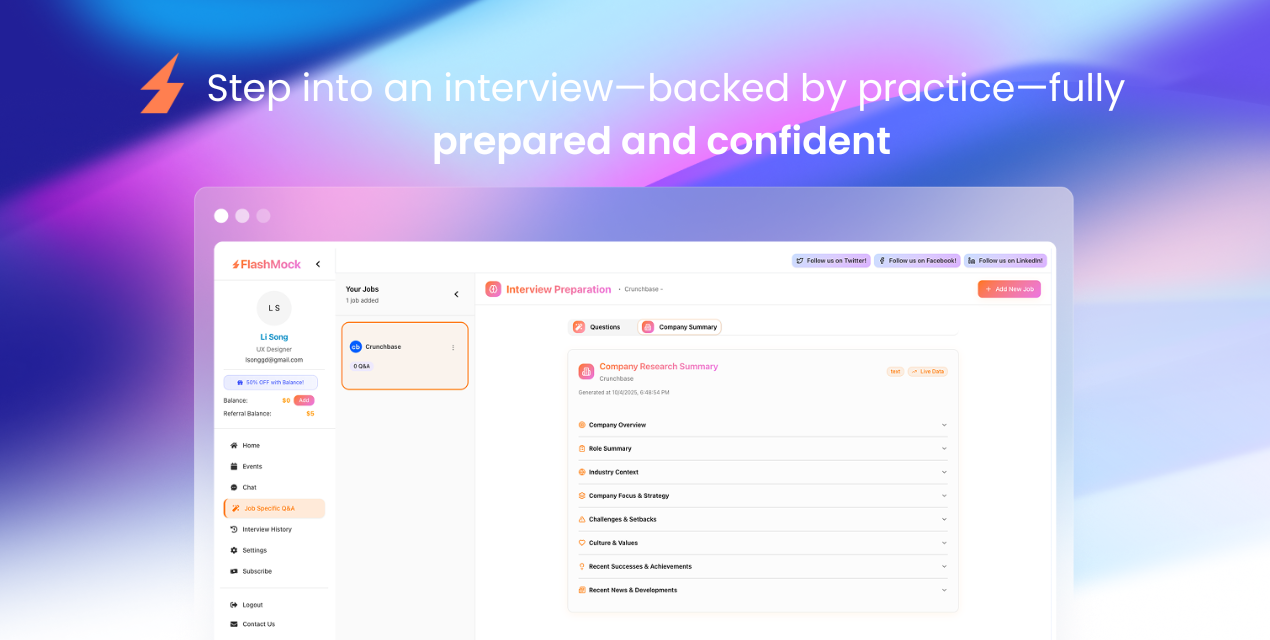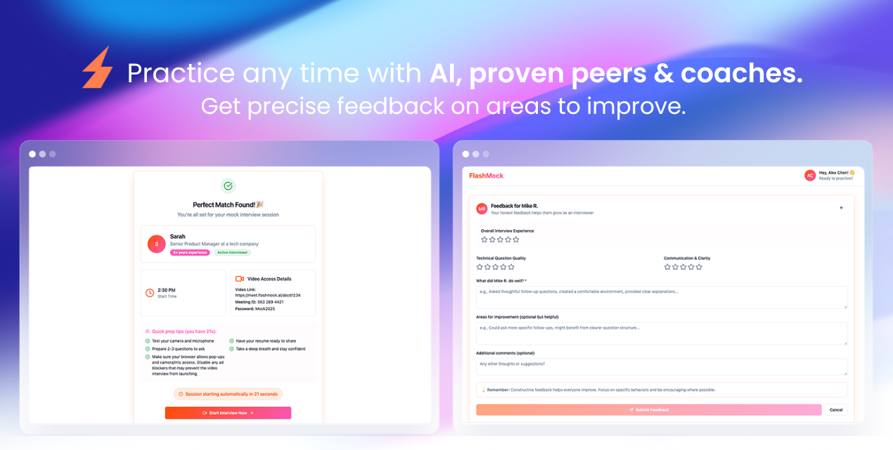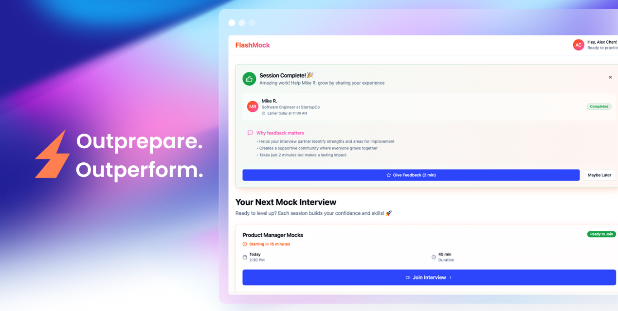 FlashMock is the training ground for ambitious professionals to land their dream job. Practice live with peers, AI, and expert coaches. Get tailored feedback, and build real confidence through repetition. Out prepare. Outperform.
