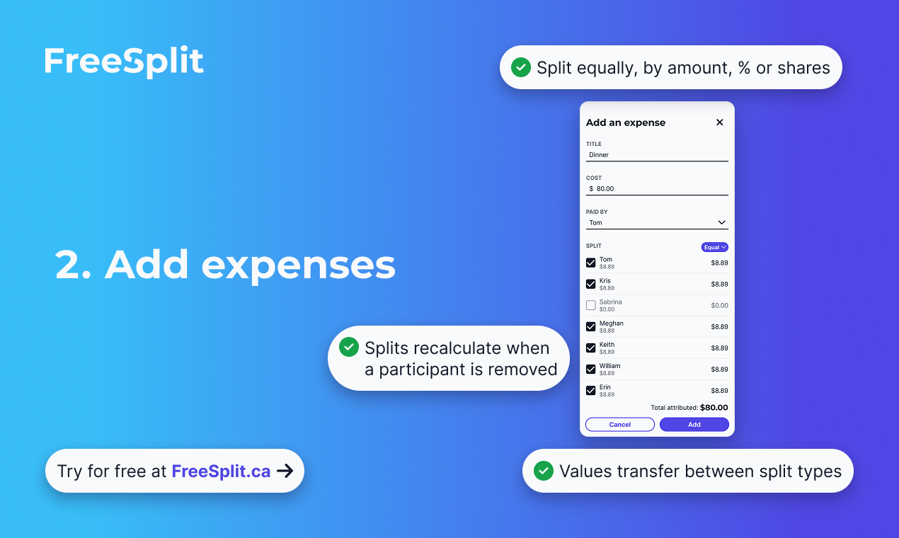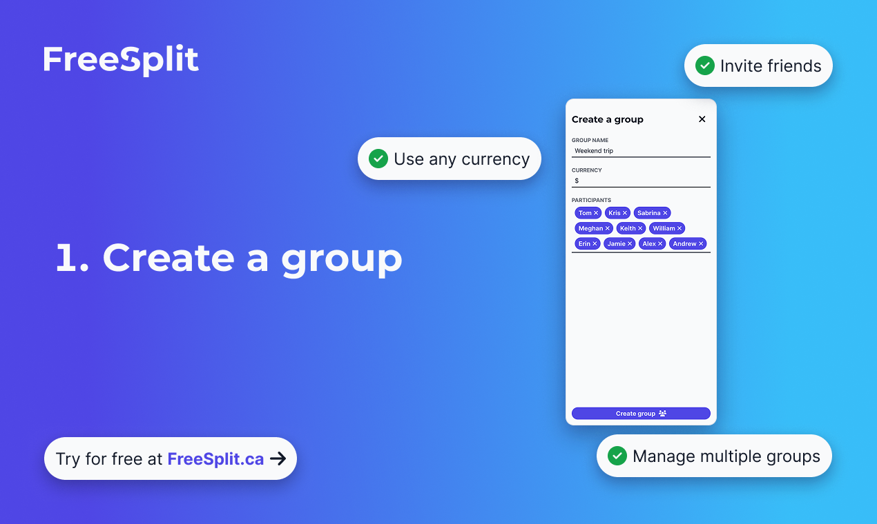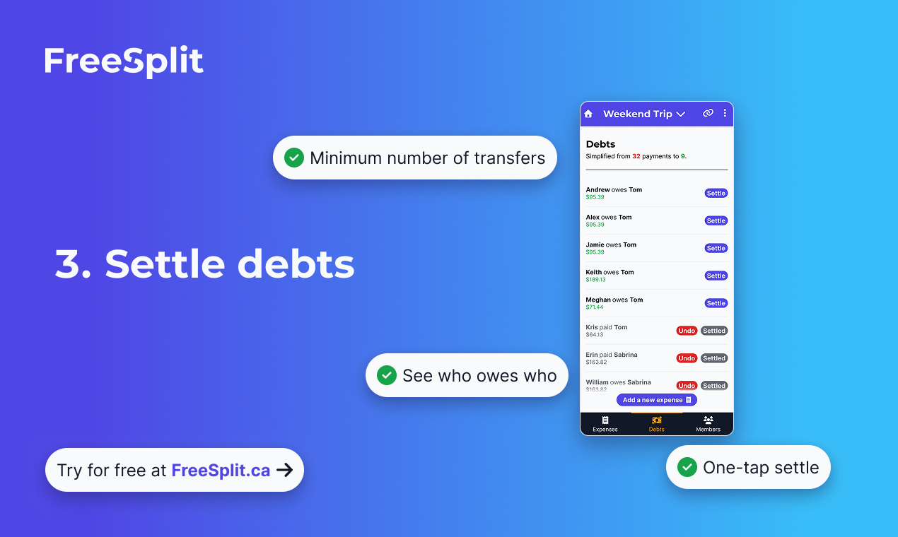 FreeSplit helps groups split shared costs without limits. Split expenses equally, or by amount, percentage or shares. FreeSplit then automatically calculates the fewest transactions required for everyone to be repaid, so you can settle debts quickly.