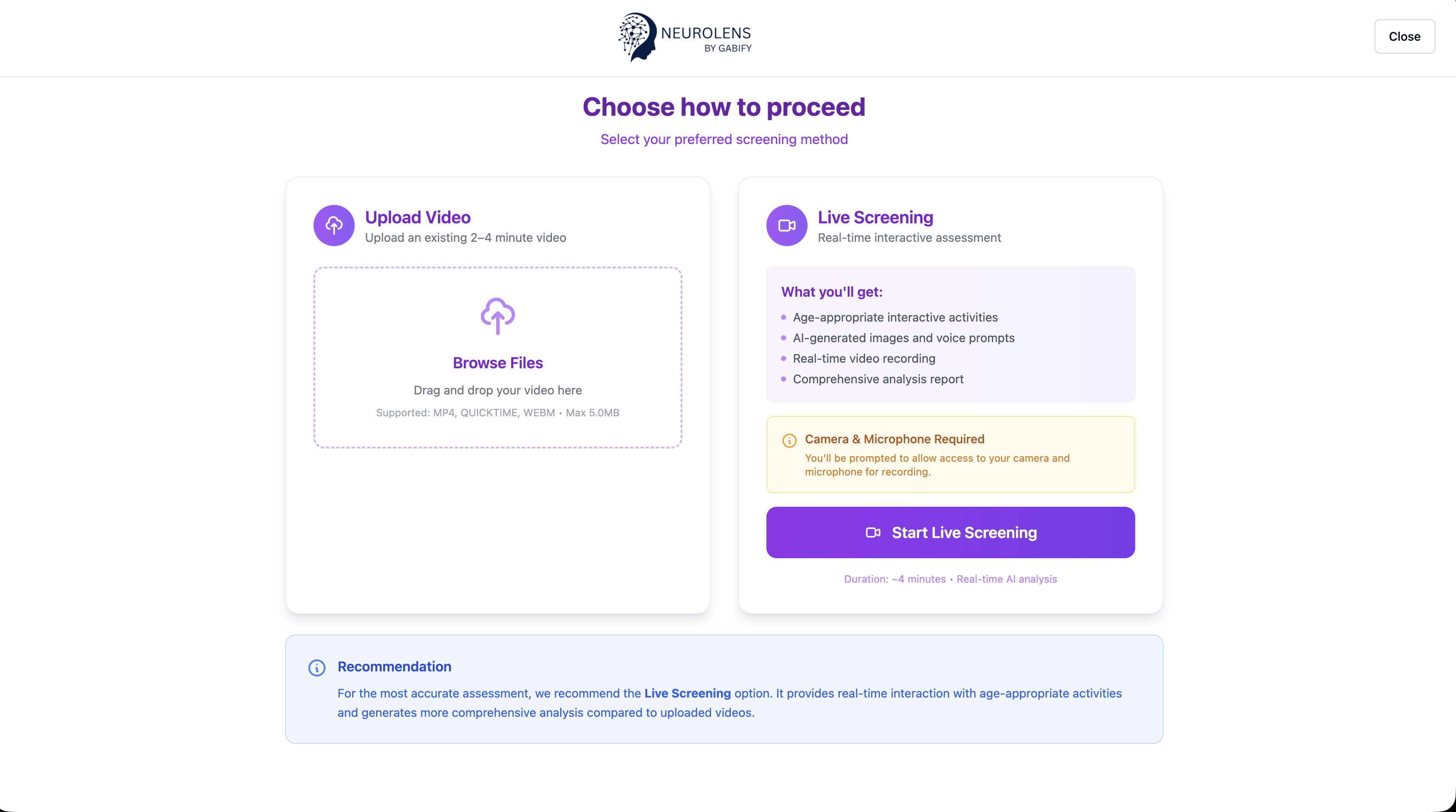 Neurolens by Gabify is an AI-powered tool that helps parents and clinicians screen for early signs of speech and neurodevelopmental disorders—like Autism—through a simple video or voice upload. Fast, accessible, and clinically validated.
