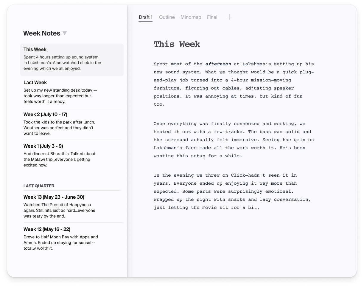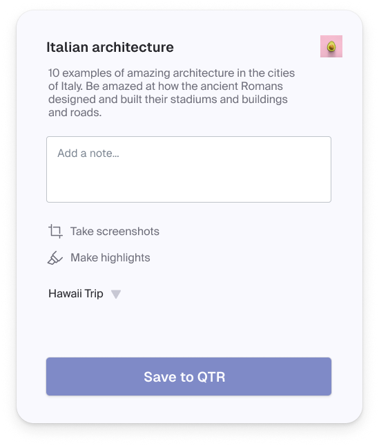 <p>Hi everyone 👋<br></p><p>I’m Prabha, co-founder and frontend engineer at QTR.<br></p><p>I put in a LOT of effort into making QTR feel intuitive. Clean and minimal is our philosophy, and almost everyone who tried our beta told us the UX looks simple and beautiful. We want the tool to get out of your way, so you can focus on the actual work.<br></p><p>Would love your thoughts and feedback on how we can make it even better! 🙏</p>