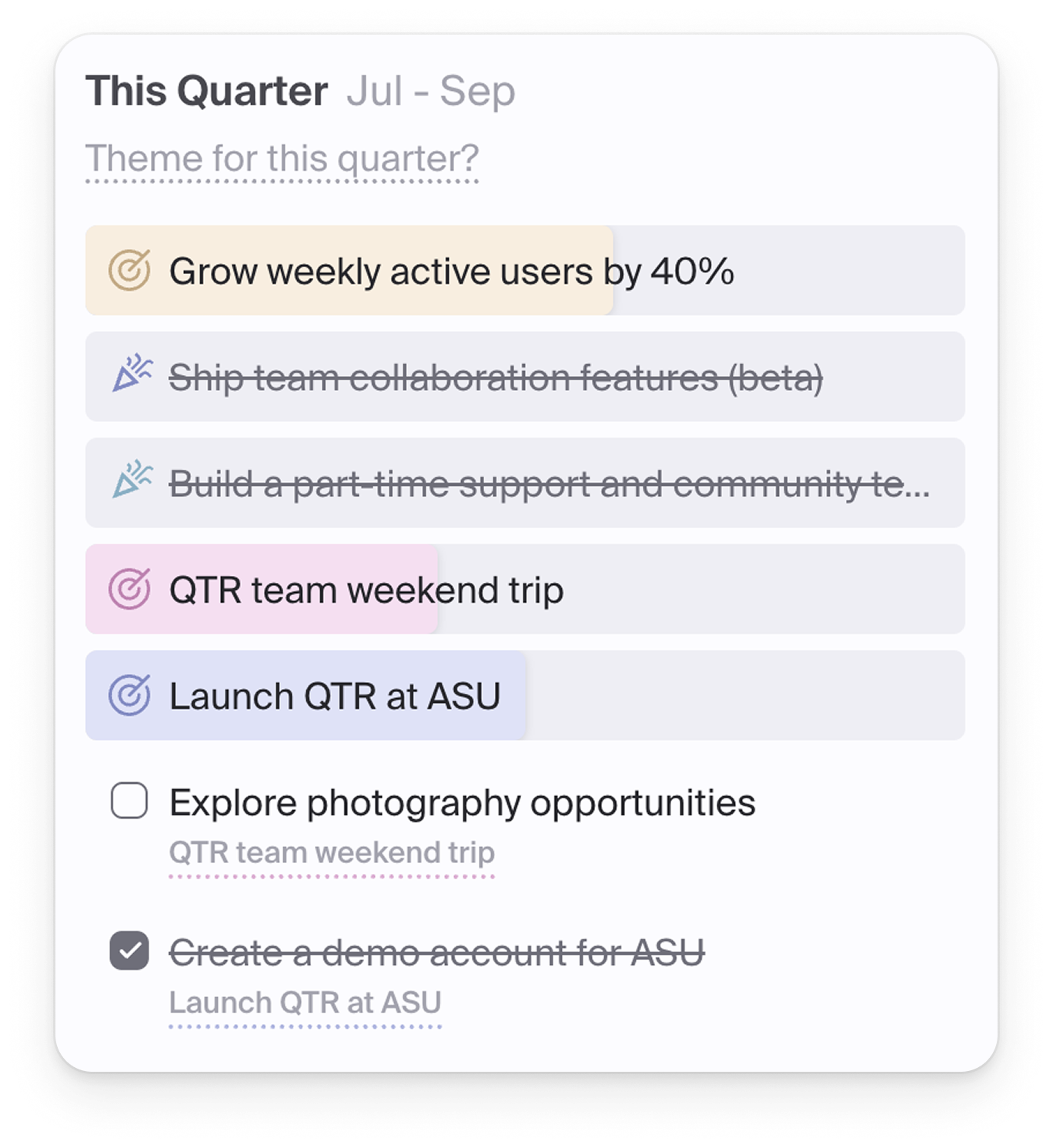 Hey everyone, I’m Rishi, co-founder and backend engineer at QTR. I’ve been focused on building the foundation that keeps QTR fast, stable, and reliable as you plan and track your goals. It’s been amazing seeing how people use it in different ways, from journaling to detailed goal tracking. We have a lot of exciting updates coming soon, including an AI sidebar that takes your planning experience to the next level with the support of LLMs that understands your goals and plans. All your planning and journaling data is fully encrypted, so your information stays private and secure. I’m looking forward to sharing more and hearing what you think.