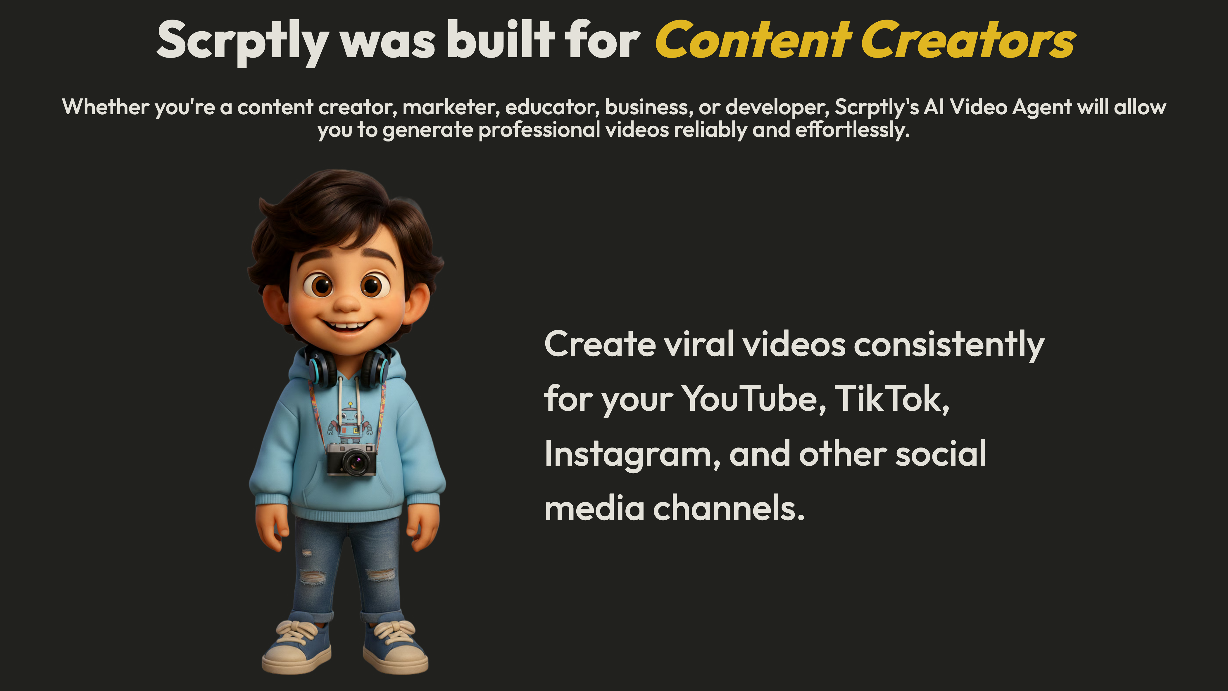 Scrptly is a AI Video Agent that helps you create stunning videos in minutes. Generate ads, documentaries, TikToks, YouTube videos, or short films with narration, characters, and stock footage — all automatically.