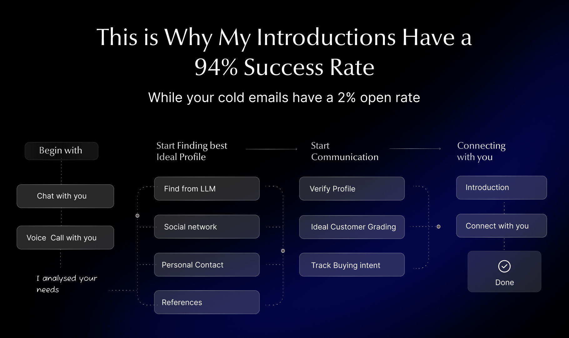 Vance is an AI super-connector. Talk to him over a call to share your story, background, and what you’re looking for. He then checks his network to see who can help or who’s looking for you and makes the introduction.